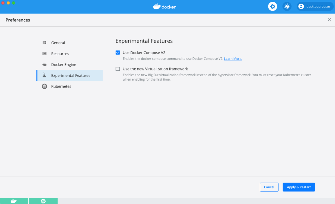 اگر با استفاده از Compose V2 به مشکل برخوردید ، به سادگی فرمان docker-compose disable-v2 را اجرا کنید ، یا با استفاده از ویژگی های تجربی Docker Desktop آن را خاموش کنید.
